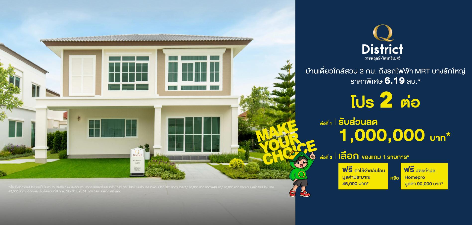 เจ้าของโครงการและผู้มีกรรมสิทธิ์ในที่ดิน บริษัท ควอลิตี้เฮ้าส์ จำกัด (มหาชน) ทะเบียนเลขที่ 0107536000579 สำนักงานใหญ่ตั้งอยู่เลขที่ 1 อาคารคิวเฮ้าส์ ลุมพินี ชั้น 7 ถนนสาทรใต้ แขวง ทุ่งมหาเมฆ เขตสาทร กรุงเทพมหานคร 10120 กรรมการผู้จัดการ นายประวิทย์ โชติวัฒนาพันธุ์ ทุนจดทะเบียน 10,714,426,091 บาท (ทุนชำระแล้ว : 10,714,381,645 บาท) โครงการ Q District ราชพฤกษ์-รัตนาธิเบศร์ ที่ตั้งโครงการ ตำบล บางรักพัฒนา อำเภอ บางบัวทอง จังหวัด นนทบุรี ใบอนุญาตจัดสรรที่ดินเลขที่ 73/2562 ที่ดินโฉนดเลขที่ 876 เนื้อที่โครงการประมาณ 35-0-41.7 ไร่ ทรัพย์สินส่วนสาธารณูปโภคและบริการสาธารณะ จำนวน 11 แปลง เนื้อที่ประมาณ 15-2-13.6 ไร่ เริ่มก่อสร้างประมาณ สิงหาคม 2562 คาดว่าจะแล้วเสร็จ ธันวาคม 2570 ที่ดินไม่มีภาระผูกพัน สโมสรและสระว่ายน้ำเป็นบริการสาธารณะ ทั้งนี้ บริษัทสามารถโอนกรรมสิทธิ์ที่ดินพร้อมสิ่งปลูกสร้างให้แก่ผู้ซื้อได้ภายใน 30 วัน หลังจากผู้ซื้อชำระราคาครบถ้วนแล้ว
