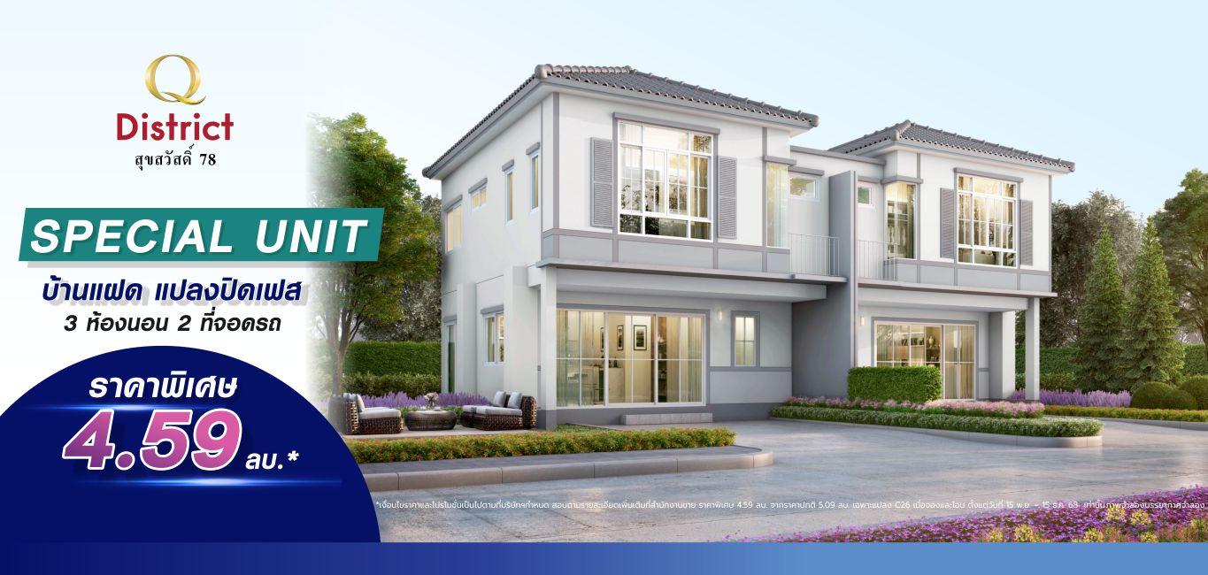 เจ้าของโครงการและผู้มีกรรมสิทธิ์ในที่ดิน : บริษัท คาซ่า วิลล์ (เพชรบุรี 2553) จำกัด ทะเบียนเลขที่0105553071860 สำนักงานใหญ่เลขที่ 1 อาคารคิวเฮ้าส์ ลุมพินี ชั้น 7 ถนนสาทรใต้ แขวงทุ่งมหาเมฆ เขตสาทร กรุงเทพมหานคร 10120 กรรมการผู้จัดการ : นายประวิทย์ โชติวัฒนาพันธุ์ ทุนจดทะเบียน 5,000,000 บาท (ชำระค่าหุ้นเต็มมูลค่าแล้ว) โครงการ Q District สุขสวัสดิ์ 78 ที่ตั้งโครงการ ตำบล/แขวง ในคลองบางปลากด, ทุ่งครุ อำเภอ/เขต พระสมุทรเจดีย์, ทุ่งครุ จังหวัด สมุทรปราการ, กรุงเทพมหานคร ใบอนุญาตจัดสรรที่ดิน เลขที่ 54/2565, 105/2565 ที่ดินโฉนดเลขที่ 3682, 3683, 7236, 7237, 12911, 12912, 12913, 82662, 82663, 82664, 82688, 25843 เนื้อที่นำมาจัดสรรประมาณ 38-2-11.1 ไร่ ทรัพย์สินส่วนสาธารณูปโภคและบริการสาธารณะ จำนวน 8 แปลง คิดเป็นพื้นที่โดยประมาณ 14-1-86.6 ไร่ เริ่มก่อสร้าง สิงหาคม 2565 คาดว่าจะแล้วเสร็จ สิงหาคม 2568 ที่ดินไม่มีภาระผูกพัน สโมสรและสระว่ายน้ำ เป็นบริการสาธารณะ ทั้งนี้ สามารถโอนกรรมสิทธิ์ที่ดินพร้อมสิ่งปลูกสร้างให้แก่ผู้ซื้อได้ภายใน 30 วัน หลังจากผู้ซื้อชำระราคาครบถ้วนแล้ว