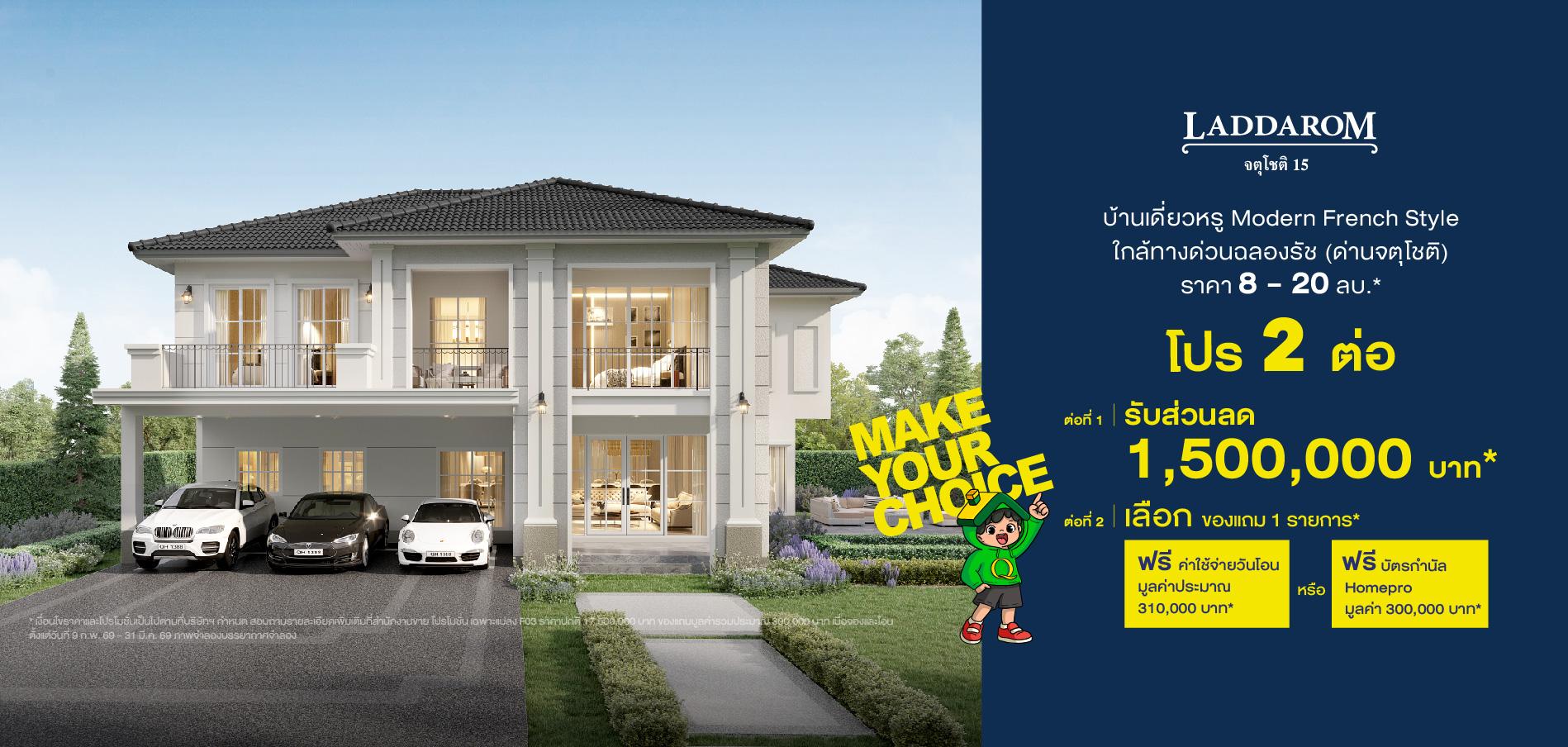 เจ้าของโครงการและผู้มีกรรมสิทธิ์ในที่ดิน : บริษัท คาซ่า วิลล์ (ชลบุรี 2554) จำกัด ทะเบียนเลขที่ 0105554054659 สำนักงานใหญ่ตั้งอยู่ เลขที่ 1 อาคารคิวเฮ้าส์ ลุมพินี ชั้น 7 ถนนสาทรใต้ แขวงทุ่งมหาเมฆ เขตสาทร กรุงเทพมหานคร 10120 กรรมการผู้จัดการ : นายประวิทย์ โชติวัฒนาพันธุ์ ทุนจดทะเบียน : 5,000,000 บาท (ทุนชำระแล้ว : 5,000,000 บาท) โครงการ ลัดดารมย์ จตุโชติ 15 ที่ตั้งโครงการ : แขวงออเงิน (ออเงินใหญ่) เขตสายไหม จังหวัดกรุงเพทมหานคร ใบอนุญาตจัดสรรที่ดินเลขที่ 53/2565 โฉนดเลขที่ 707 (บางส่วน), 709 (บางส่วน), 13074, 13225, 21469, 21471, 21473, 24128, 46515, 46574, 46704 (บางส่วน), 46921 (บางส่วน), 47283, 47284, 47285, 47288, 47289, 47290, 47292, 47329, 47330, 47331, 47332, 47333, 47334, 154752 (บางส่วน), 154753 (บางส่วน), 154754 (บางส่วน)และ 180270 เนื้อที่นำมาจัดสรร 59-2–40.5 ไร่ ทรัพย์สินส่วนสาธารณูปโภคและบริการสาธารณะ จำนวน 8 แปลง คิดเป็นพื้นที่โดยประมาณ 18-3–89.4 ไร่ ที่ดินไม่มีภาระผูกพัน เริ่มก่อสร้าง มิถุนายน 2565 คาดว่าจะแล้วเสร็จ พฤษภาคม 2570 สโมสรและสระว่ายน้ำเป็นบริการสาธารณะ ทั้งนี้ บริษัทสามารถโอนกรรมสิทธิ์ที่ดินพร้อมสิ่งปลูกสร้างให้แก่ผู้ซื้อได้ภายใน 30 วัน หลังจากผู้ซื้อชำระราคาครบถ้วนแล้ว