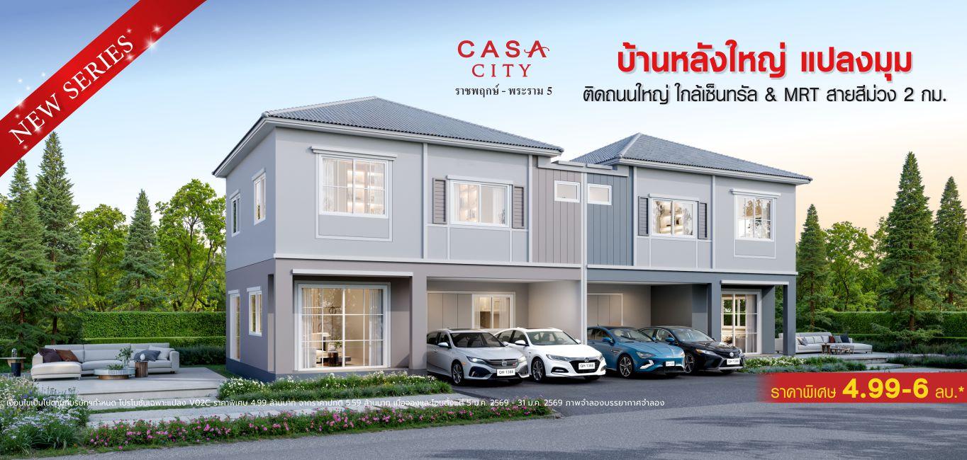 เจ้าของโครงการและผู้มีสิทธิ์ในที่ดิน : บริษัท คาซ่า วิลล์ จำกัด ทะเบียนเลขที่ 0105536123351 สำนักงานใหญ่ เลขที่ 1 อาคารคิวเฮ้าส์ ลมุพินี ชั้น7 ถนนสาทรใต้ แขวงทุ่งมหาเมฆ เขตสาทร กรุงเทพมหานคร 10120 กรรมการผู้จัดการ : นายประวิทย์ โชติวัฒนาพันธุ์ ทุนจดทะเบียน 3,000,000,000 บาท (ชำระเต็มจำนวน) โครงการ คาซ่า ซิตี้ ราชพฤกษ์-พระราม 5 ที่ตั้งโครงการ ตำบลบางเลน อำเภอบางใหญ่ จังหวัดนนทบุรี ใบอนุญาตจัดสรรที่ดินเลขที่ 44/2557 ที่ดินโฉนดเลขที่ 102378 เนื้อที่โครงการประมาณ 46-2-68ไร่ ทรัพย์สินส่วนสาธารณูปโภคและบริการสาธารณะ จำนวน 15 แปลง 1-1-30.1 ไร่ ที่ดินไม่มีภาระผูกพัน เริ่มก่อสร้าง กรกฎาคม 2557 คาดว่าจะแล้วเสร็จ มกราคม 2560 สโมสรและสระว่ายน้ำเป็นบริการสาธารณะ ทั้งนี้ บริษัทสามารถโอนกรรมสิทธิ์ที่ดินพร้อมสิ่งปลูกสร้างให้แก่ผู้ซื้อได้ภายใน 30 วัน หลังจากผู้ซื้อชำระราคาครบถ้วนแล้ว