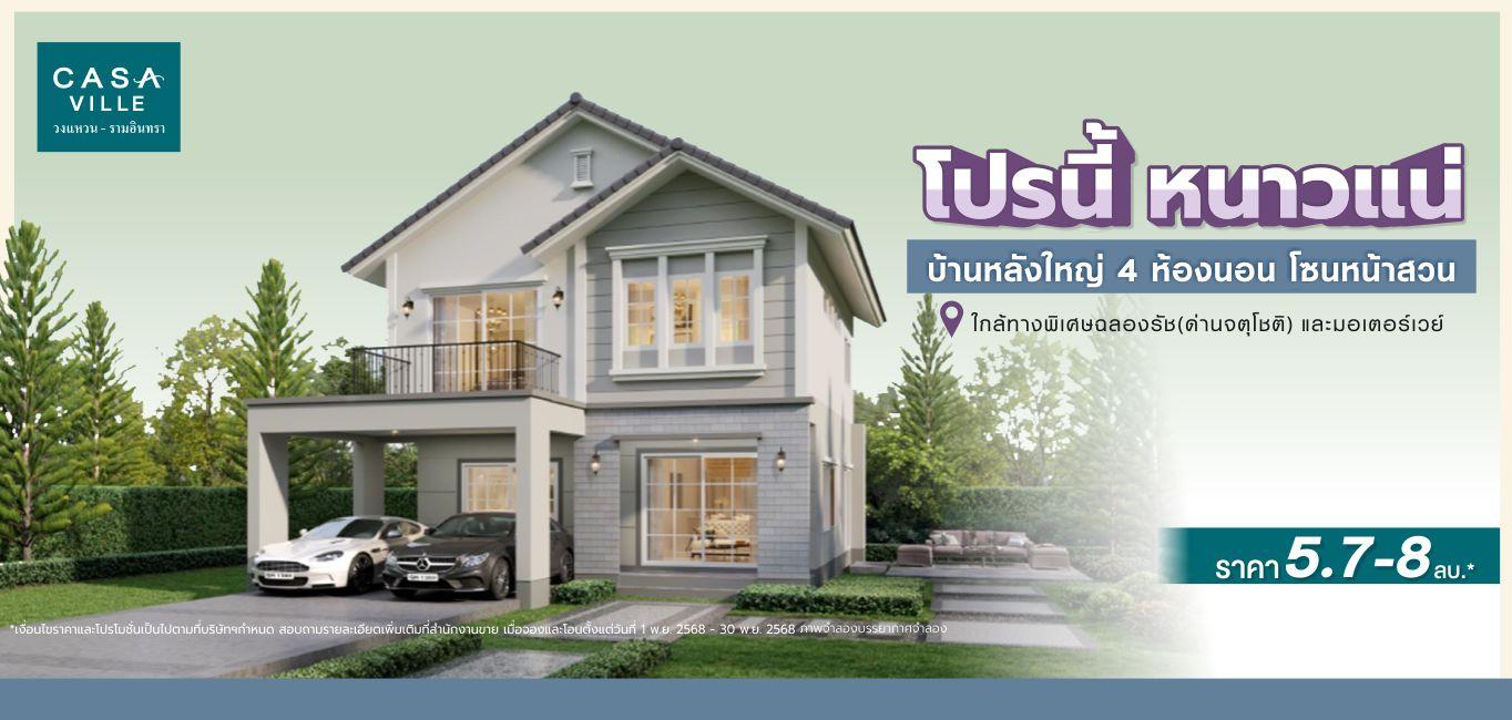เจ้าของโครงการและผู้มีกรรมสิทธิ์ในที่ดิน : บริษัท คาซ่า วิลล์ จำกัด ทะเบียนเลขที่ 0105536123351 สำนักงานใหญ่ตั้งอยู่เลขที่ 1 อาคารคิวเฮ้าส์ ลุมพินี ชั้น 7 ถนนสาทรใต้ แขวงทุ่งมหาเมฆ เขตสาทร กรุงเทพมหานคร 10120 กรรมการผู้จัดการ : นายประวิทย์ โชติวัฒนาพันธุ์ ทุนจดทะเบียน : 3,000,000,000 บาท (ชำระค่าหุ้นเต็มมูลค่าแล้ว) โครงการ คาซ่าวิลล์ วงแหวน-รามอินทรา ที่ตั้งโครงการ แขวงออเงิน เขตสายไหม จังหวัด กรุงเทพมหานคร ใบอนุญาตจัดสรรที่ดินเลขที่ 70/2562 ที่ดินโฉนดเลขที่ 1141, 1142, 1143, 1144, 12265, 35337, 35338, 35339, 35340, 35341, 36050 และ36584 เนื้อที่โครงการประมาณ 89-3-34.7 ไร่ ทรัพย์สินส่วนสาธารณูปโภคและบริการสาธารณะ จำนวน 9 แปลง 29-2-64.7 ไร่ ที่ดินไม่มีภาระผูกพัน เริ่มก่อสร้าง มิถุนายน 2562 คาดว่าจะแล้วเสร็จ มิถุนายน 2567 สโมสรและสระว่ายน้ำเป็นบริการสาธารณะ ทั้งนี้ บริษัทสามารถโอนกรรมสิทธิ์ที่ดินพร้อมสิ่งปลูกสร้างให้แก่ผู้ซื้อได้ภายใน 30 วัน หลังจากผู้ซื้อชำระราคาครบถ้วนแล้ว