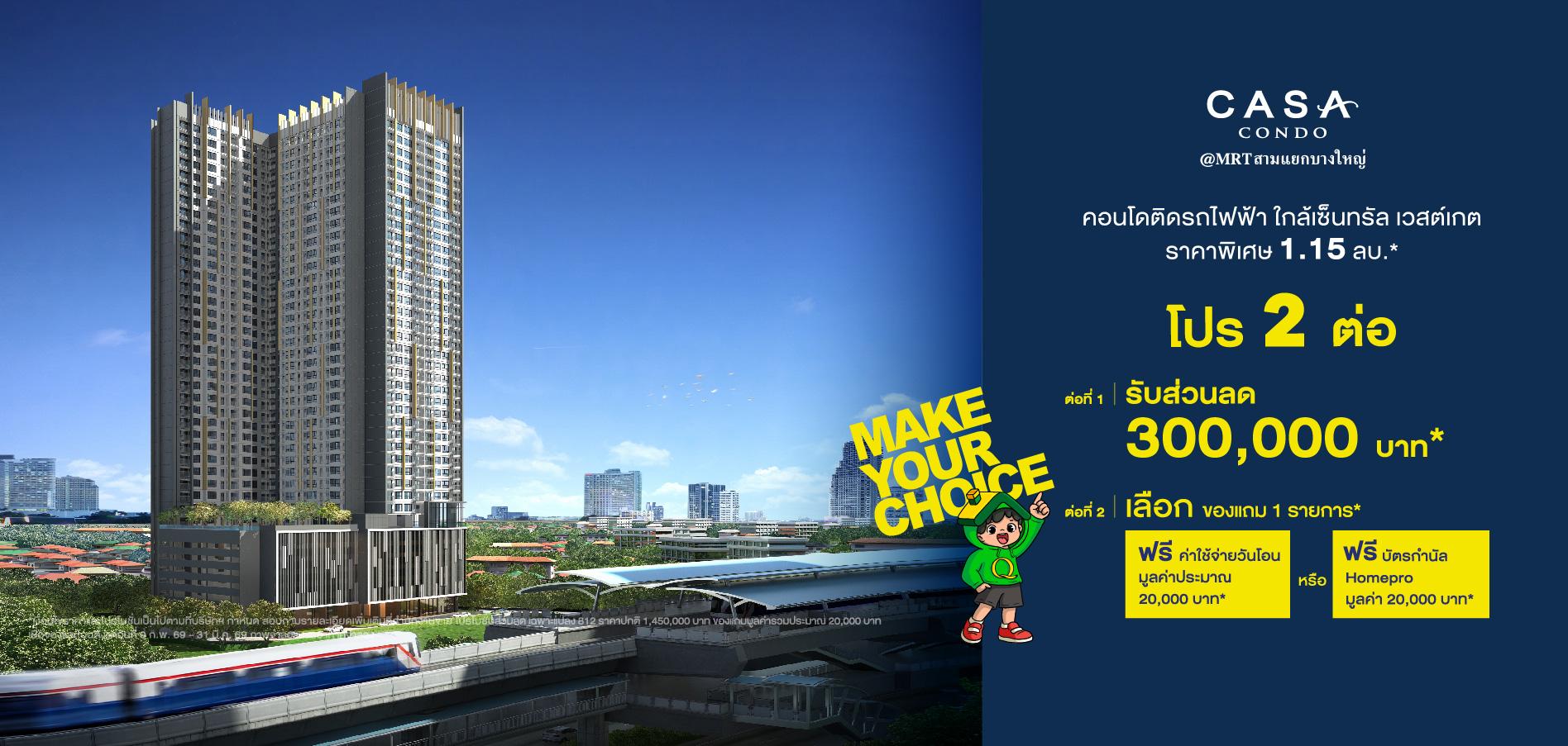 เจ้าของโครงการและผู้มีสิทธิ์ในที่ดิน : บริษัท คาซ่า วิลล์ จำกัด ทะเบียนเลขที่ 0105536123351 สำนักงานใหญ่ เลขที่ 1 อาคารคิวเฮ้าส์ ลมุพินี ชั้น7 ถนนสาทรใต้ แขวงทุ่งมหาเมฆ เขตสาทร กรุงเทพมหานคร 10120 กรรมการผู้จัดการ : นายประวิทย์ โชติวัฒนาพันธุ์ ทุนจดทะเบียน 3,000,000,000 บาท (ชำระเต็มจำนวน) โครงการ คาซ่า คอนโด @ MRT สามแยกบางใหญ่ ที่ดินโฉนดเลขที่ 105475 ที่ตั้งโครงการ ถนนรัตนาธิเบศร์ ตำบลเสาธงหิน อำเภอบางใหญ่ จังหวัดนนทบุรี เนื้อที่โครงการ 3-1-21.2 ไร่ มีภาระผูกพันกับธนาคารไทยพาณิชย์ จํากัด (มหาชน) ทะเบียนอาคารชุดเลขที่ 2/2560 ได้รับความเห็นชอบตามกฎหมายว่าด้วยการส่งเสริมและรักษาคุณภาพสิ่งแวดล้อม ตามหนังสือเลขที่ ทส 1009.5/5583 ลงวันที่ 15 พฤษภาคม 2558 อาคารชุดพักอาศัยสูง 39 ชั้น รวม 847 ยูนิต แบ่งเป็นห้องชุดพักอาศัย 844 ยูนิต และห้องชุดเพื่อการพาณิชย์ 3 ยูนิต และพื้นที่สีเขียว รวมประมาณ 2,609.92 ตารางเมตร โอนกรรมสิทธิ์หลังจากผู้ซื้อชำระเงินครบถ้วนตามสัญญา เจ้าของห้องชุดมีหน้าที่ต้องชำระค่าใช้จ่ายและค่าภาษีอากรตามกฎหมายว่าด้วยอาคารชุด