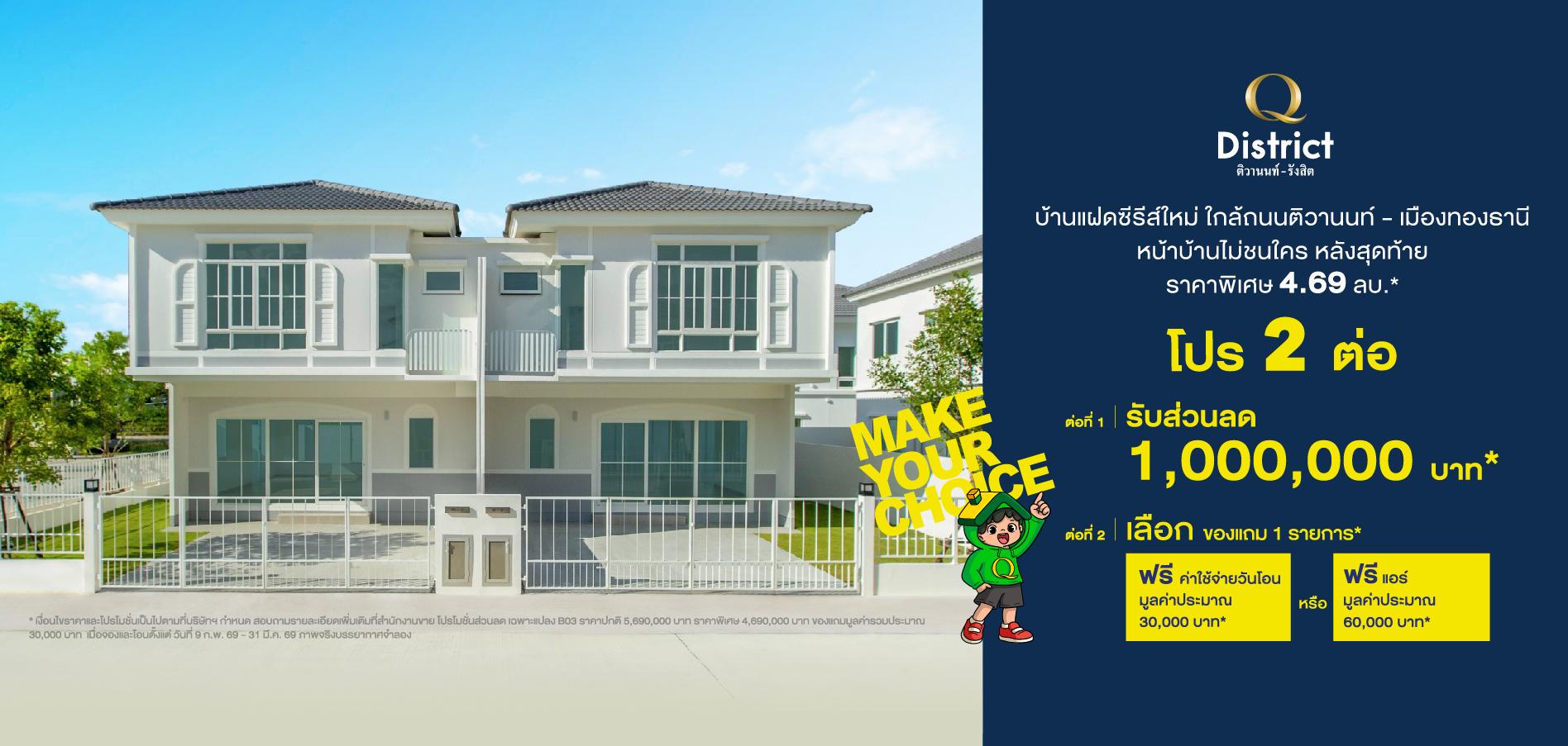 เจ้าของโครงการและผู้มีกรรมสิทธิ์ในที่ดิน : บริษัท คาซ่า วิลล์ (ชลบุรี 2554) จำกัด ทะเบียนเลขที่ 0105554054659 สำนักงานใหญ่เลขที่ 1 อาคารคิวเฮ้าส์ ลุมพินี ชั้น 7 ถนนสาทรใต้ แขวงทุ่งมหาเมฆ เขตสาทร กรุงเทพมหานคร 10120 กรรมการผู้จัดการ : นายประวิทย์ โชติวัฒนาพันธุ์ ทุนจดทะเบียน 3,005,000,000 บาท (ชำระค่าหุ้นเต็มมูลค่าแล้ว) โครงการ Q District ติวานนท์-รังสิต ที่ตั้งโครงการ แขวง/ตำบล บ้านใหม่ เขต/อำเภอ เมืองปทุมธานี จังหวัด ปทุมธานี ใบอนุญาตจัดสรรที่ดิน เลขที่ 52/2567 ที่ดินโฉนดเลขที่ 3828, 10515, 10516, 40483, 40484, 67715, 67716 (รวม 7 โฉนด) เนื้อที่โครงการประมาณ 32-2-47.9 ไร่ ทรัพย์สินส่วนสาธารณูปโภคและบริการสาธารณะ จำนวน 6 แปลง 11-2-24.1 ไร่ เริ่มก่อสร้างประมาณ มกราคม 2567 คาดว่าจะแล้วเสร็จ ธันวาคม 2570 ที่ดินไม่มี ภาระผูกพัน สโมสรและสระว่ายน้ำเป็นบริการสาธารณะ ทั้งนี้ บริษัทสามารถโอนกรรมสิทธิ์ที่ดินพร้อมสิ่งปลูกสร้างให้แก่ผู้ซื้อได้ภายใน 30 วัน หลังจากผู้ซื้อชำระราคาครบถ้วนแล้ว
