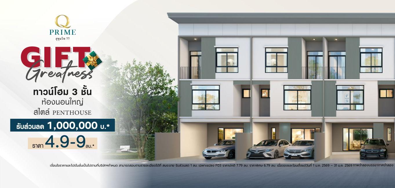 เจ้าของโครงการและผู้มีกรรมสิทธิ์ในที่ดิน : บริษัท ควอลิตี้เฮ้าส์ จำกัด (มหาชน) ทะเบียนเลขที่ 0107536000579 สำนักงานใหญ่ตั้งอยู่ เลขที่ 1 อาคารคิวเฮ้าส์ ลุมพินี ชั้น 7 ถนนสาทรใต้ แขวงทุ่งมหาเมฆ เขตสาทร กรุงเทพมหานคร 10120 กรรมการผู้จัดการ : นายประวิทย์ โชติวัฒนาพันธุ์ ทุนจดทะเบียน : 10,714,426,091 บาท (ทุนชำระแล้ว : 10,714,381,645 บาท) โครงการ Q PRIME สุขุมวิท 77 ที่ตั้งโครงการ : แขวงอ่อนนุช เขตสวนหลวง กรุงเทพมหานคร ใบอนุญาตจัดสรรที่ดินเลขที่ 136/2562 โฉนดเลขที่ 1293,21132 (บางส่วน) เนื้อที่นำมาจัดสรร 25-0-46.5 ไร่ ทรัพย์สินส่วนสาธารณูปโภคและบริการสาธารณะ จำนวน 7 แปลง คิดเป็นพื้นที่โดยประมาณ 10-1-71.7ไร่ ที่ดินไม่มีภาระผูกพัน เริ่มก่อสร้าง พฤศจิกายน 2562 คาดว่าจะแล้วเสร็จ พฤศจิกายน 2567 สโมสรและสระว่ายน้ำเป็นบริการสาธารณะ ทั้งนี้ บริษัทสามารถโอนกรรมสิทธิ์ที่ดินพร้อมสิ่งปลูกสร้างให้แก่ผู้ซื้อได้ภายใน 30 วัน หลังจากผู้ซื้อชำระราคาครบถ้วนแล้ว