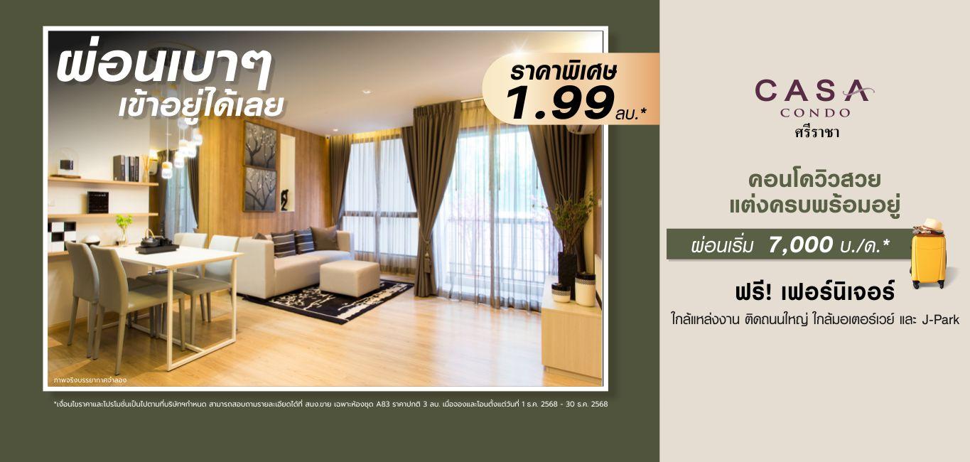 เจ้าของโครงการและผู้มีกรรมสิทธิ์ในที่ดิน : บริษัท คาซ่า วิลล์ (ระยอง2553) จำกัด ทะเบียนเลขที่ 0105553071843 สำนักงานใหญ่เลขที่ 1 อาคารคิวเฮ้าส์ ลุมพินี ชั้น7 ถนนสาทรใต้ แขวงทุ่งมหาเมฆ เขตสาทร กรุงเทพมหานคร 10120 กรรมการผู้จัดการ : นายประวิทย์ โชติวัฒนาพันธุ์ ทุนจดทะเบียน 5,000,000 บาท (ชำระค่าหุ้นเต็มมูลค่าแล้ว) โครงการคาซ่า คอนโด ศรีราชา 1 อาคารชุดพักอาศัยสูง 8 ชั้น จำนวน 1 อาคาร รวม 49 ยูนิต แบ่งเป็น ห้องชุดพักอาศัย 49 ยูนิต และละห้องชุดเพื่อการพาณิชย์ 0 ยูนิต และพื้นที่สีเขียว รวมประมาณ 185.8 ตารางเมตร ที่ตั้งโครงการ ถนนทางหลวงแผ่นดินสายต่อเขตเทศบาลศรีราชาควบคุม-บรรจบทางหลวงหมายเลข 331 (3241) ตำบลสุรศักดิ์ อำเภอศรีราชา จังหวัดชลบุรี ที่ดินโฉนดเลขที่ 203122 เนื้อที่โครงการประมาณ 1-0-49.4 ไร่ ไม่มีภาระผูกพัน ทะเบียนอาคารชุดเลขที่ 6/2559 โอนกรรมสิทธิ์หลังจากผู้ซื้อชำระเงินครบถ้วนตามสัญญา เจ้าของห้องชุดมีหน้าที่ต้องชำระค่าใช้จ่ายและค่าภาษีอากรตามกฎหมายว่าด้วยอาคารชุด อาคารสโมสรและสระว่ายน้ำ และที่ดินที่ตั้งอาคารสโมสรและสระว่ายน้ำเป็นทรัพย์ส่วนกลางร่วมของนิติบุคคลอาคารชุด ถนนในโครงการที่ใช้เข้า-ออกสู่ทางสาธารณประโยชน์เป็นถนนภารจำยอม