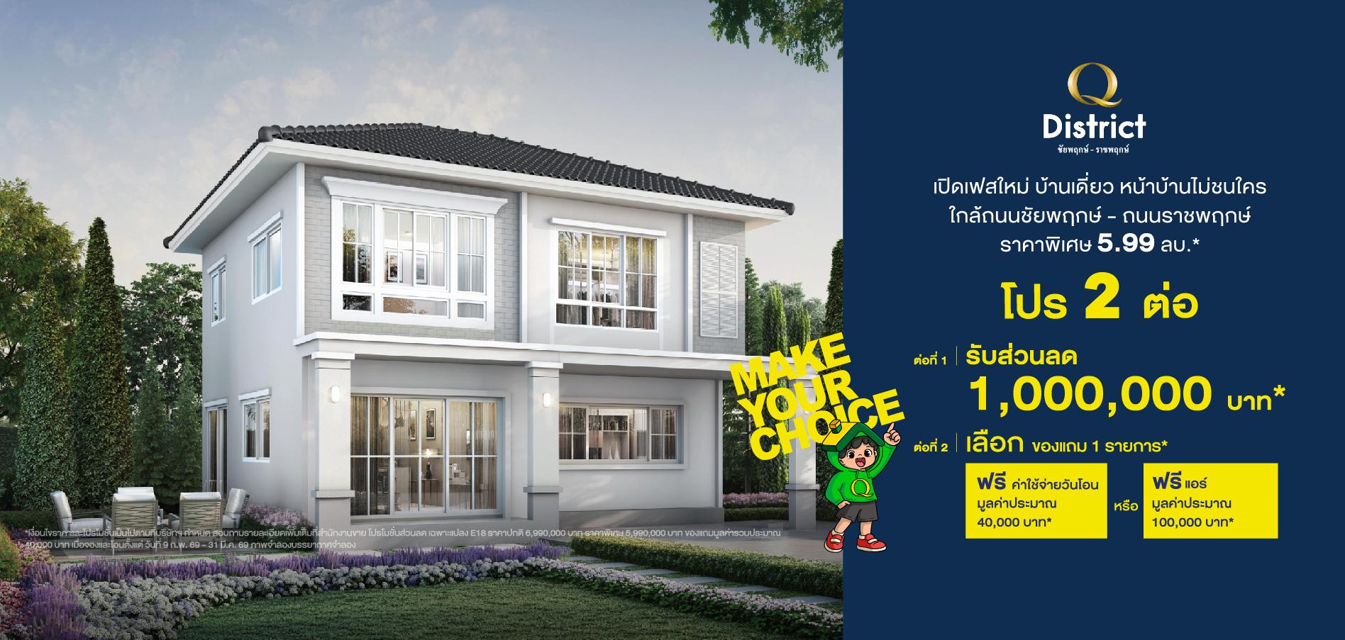 เจ้าของโครงการและผู้มีกรรมสิทธิ์ในที่ดิน : บริษัท ควอลิตี้เฮ้าส์ จำกัด (มหาชน) ทะเบียนเลขที่ 0107536000579 สำนักงานใหญ่ตั้งอยู่เลขที่ 1 อาคารคิวเฮ้าส์ ลุมพินี ชั้น 7 ถนนสาทรใต้ แขวงทุ่งมหาเมฆ เขตสาทร กรุงเทพมหานคร 10120 กรรมการผู้จัดการ : นายประวิทย์ โชติวัฒนาพันธุ์ ทุนจดทะเบียน : 10,714,426,091 บาท (ทุนชำระแล้ว : 10,714,381,645 บาท) โครงการ คิว ดิสทริค ชัยพฤกษ์-ราชพฤกษ์ ที่ตั้งโครงการ: ตำบลบางพลับ อำเภอปากเกร็ด จังหวัด นนทบุรี ใบอนุญาตจัดสรรเลขที่ 31/2565 ที่ดินโฉนดเลขที่ 71091,73742,74145 (บางส่วน) เนื้อที่โครงการประมาณ 46-1-31.6 ไร่ ที่ดินไม่มีภาระผูกพัน เริ่มก่อสร้าง เม.ย.2564 คาดว่าจะแล้วเสร็จ ธ.ค.2568 สโมสรและสระว่ายน้ำเป็นบริการสาธารณะ ทั้งนี้ บริษัทสามารถโอนกรรมสิทธิ์ที่ดินพร้อมสิ่งปลูกสร้างให้แก่ผู้ซื้อได้ภายใน 30 วัน หลังจากผู้ซื้อชำระราคาครบถ้วนแล้ว